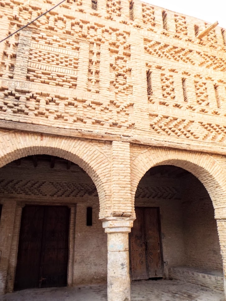 日干し煉瓦を組み合わせ、幾何学模様のように装飾された美しい壁が続きます。ここも映画『イングリッシュ・ペイジェント』のロケ地となりました。柱や梁、天井にはナツメヤシの木が使われており、この地域の砂漠気候に適しています。