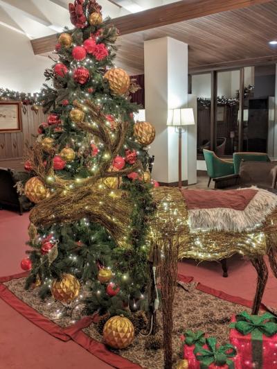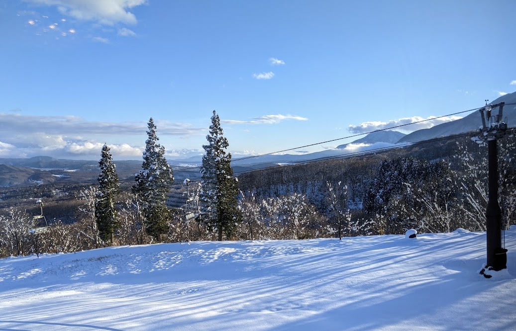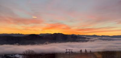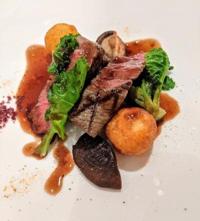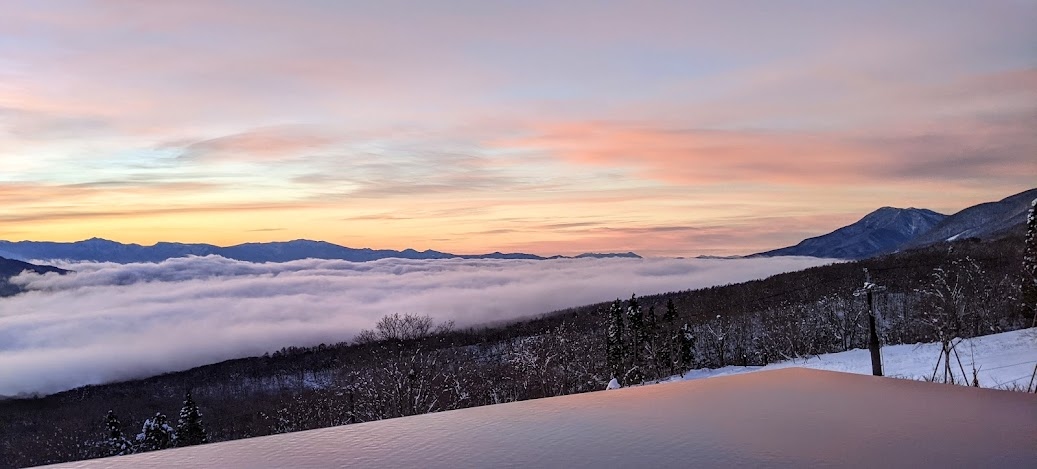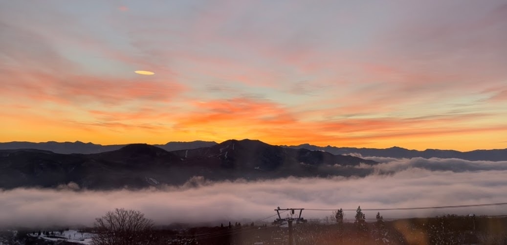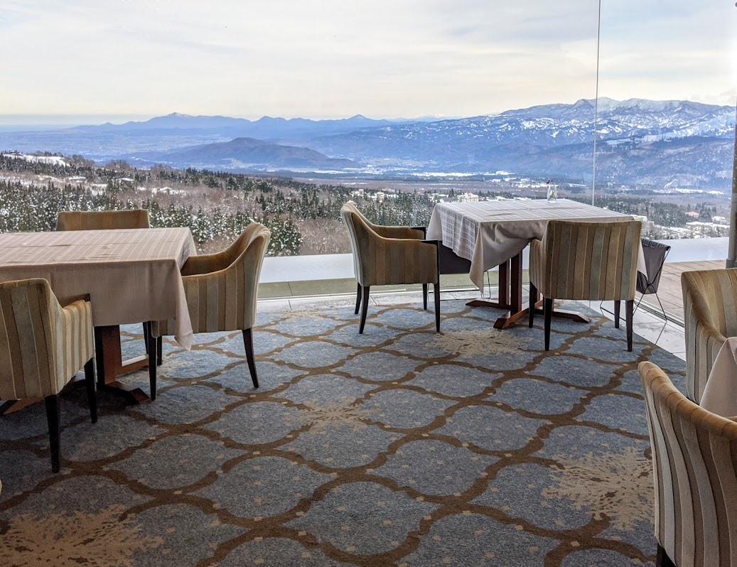 1日目のディナーは、カフェテラスの望めるレストラン室内でのフランス料理のフルコースです。夕刻ともなると、外気は零下何度ともなり、さすが外には出ることが出来ませんが、標高1000mに位置するレストランからのディナーは、薄暗闇の赤倉の山々を眺目ながら、とても幻想的な中で美味しく戴きました。
