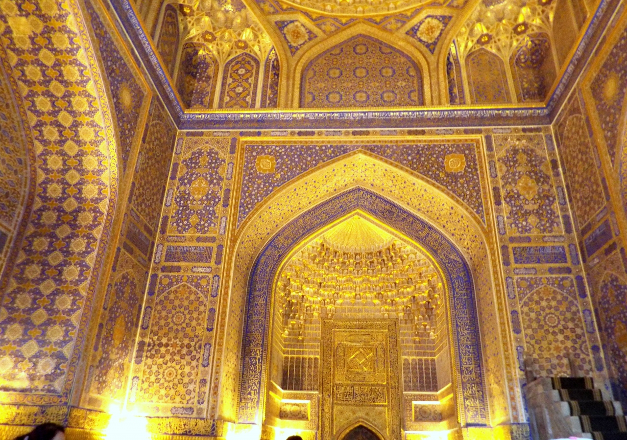 レギスタン広場の正面の真ん中にある「ティラカリ・マドラサ」は、1660年に建設されました。当時はすでにビビハムニ・モスクが破壊されていたため、マドラサでありながら、サマルカンドのメインモスクとして使われていたそうです。
