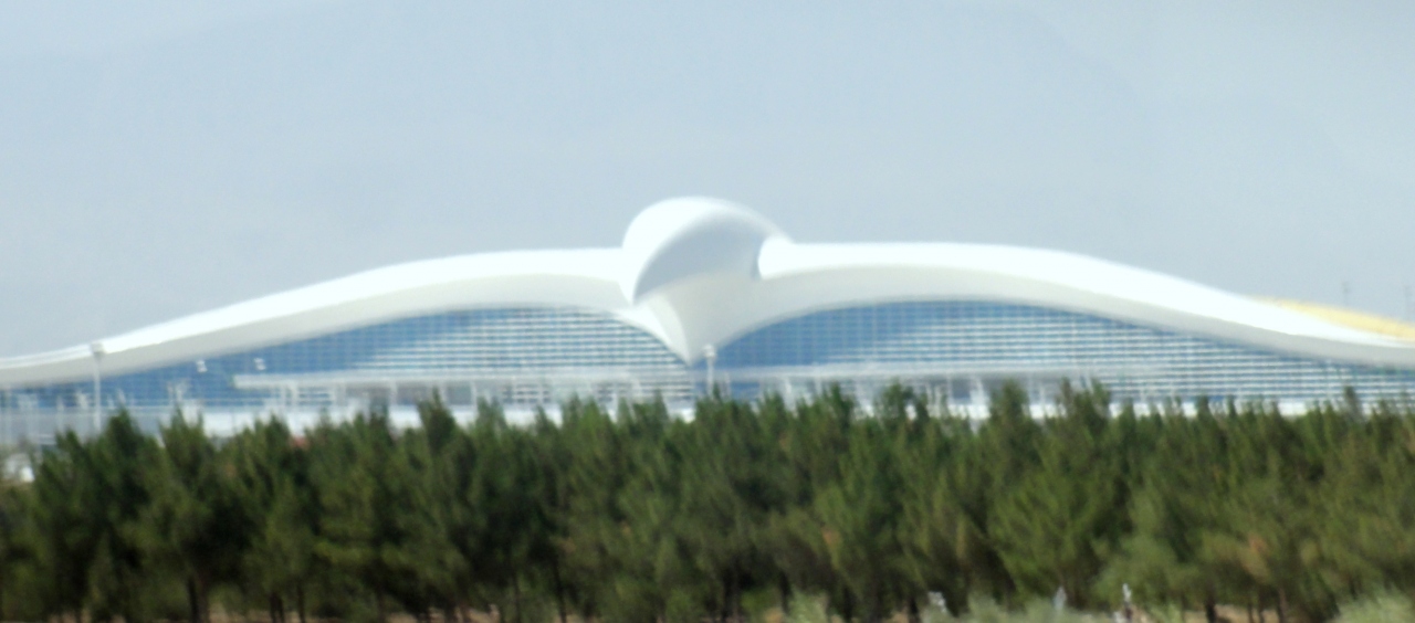 アシハバードの市街地に近付くにつれ、すぐ目の前に「世界で一番大きな鳥の形をした建造物」として有名な「アシガバード空港(ASB)」が見えて来ました。まるで青空に今にも鳥が飛び立つように、真っ白な大きな鳥が翼を広げているとても美しい空港です。