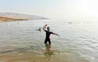一面に死海が見渡せるプライベートビーチのある、とても洒落た素敵な「ホリデイ イン リゾート デッドシー」ホテルです。部屋から水着に着替え、すぐに目の前に死海が広がっています。ビーチでお肌にいいと言われる死海の泥を全身に塗りたくっていよいよ死海に入って行きます!!