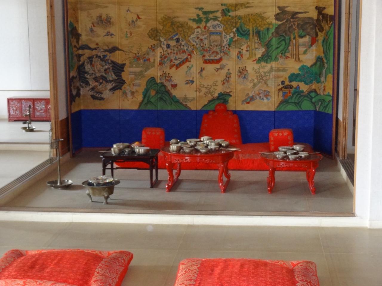 その先に宮殿があり、更に先に進むと様々な小さい宮殿があります。途中に国王が食事する間があり、韓定食(最上級版)の器が並んでいたり、生活ぶりを見る事があります。人形があれば、リアリティが高いのですが、残念。