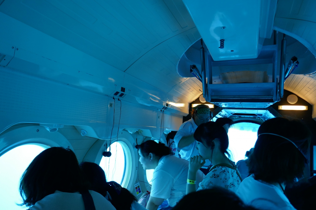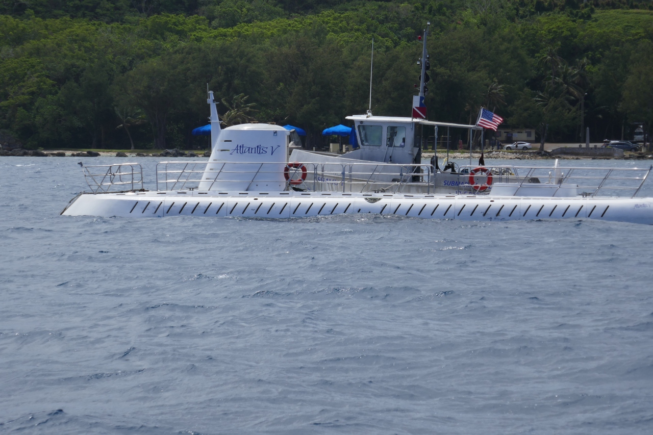 潜水艦アトランティスIVに乗ってグアムの海中を探索するツアーです。肝心の亀が見られなかったので、評価は低いです。ツアーは混んでいて、初日に予約しましたが、キャンセルが出てやっと取れました。個人的には100ドルの価値は無い様に思いますが、小さなお子さんは喜ぶと思います。乗船時間は40分ですが、約半日のツアーです。冷房も潜水艦内は効いていて快適です。