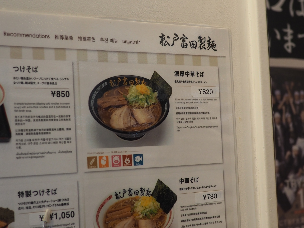 2018年夏に富田製麺で食べた記録です。私は、つけ麺より濃厚中華そばが好きなのでいつも頼んでいます。年々値上がりしていますね。この時は820円でもはやつけそば850円と大差無し。待ちも10分以上で観光や一見の方は個人的にはつけ麺の方が良いかと思いますね。
