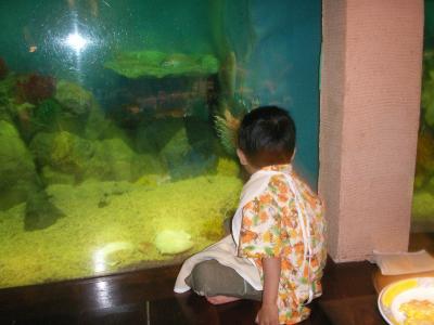 午後4時から気ままにドルフィンのプログラムに参加して、本当に目の前にイルカを見て感動そのままに、イルカのラグーン前にある海風でお夕飯でした。GW中だったこともあって、1週間前に水槽前の席を予約しましたが、どこの席も満員でした。テーブルの前で沖縄民謡を聴いた後は、炉端焼き、大人2人で10品でおなかいっぱいです。単品で注文したお刺身、もずく酢、泡盛カクテル、どれも大変美味しく大満足の夕飯でした。