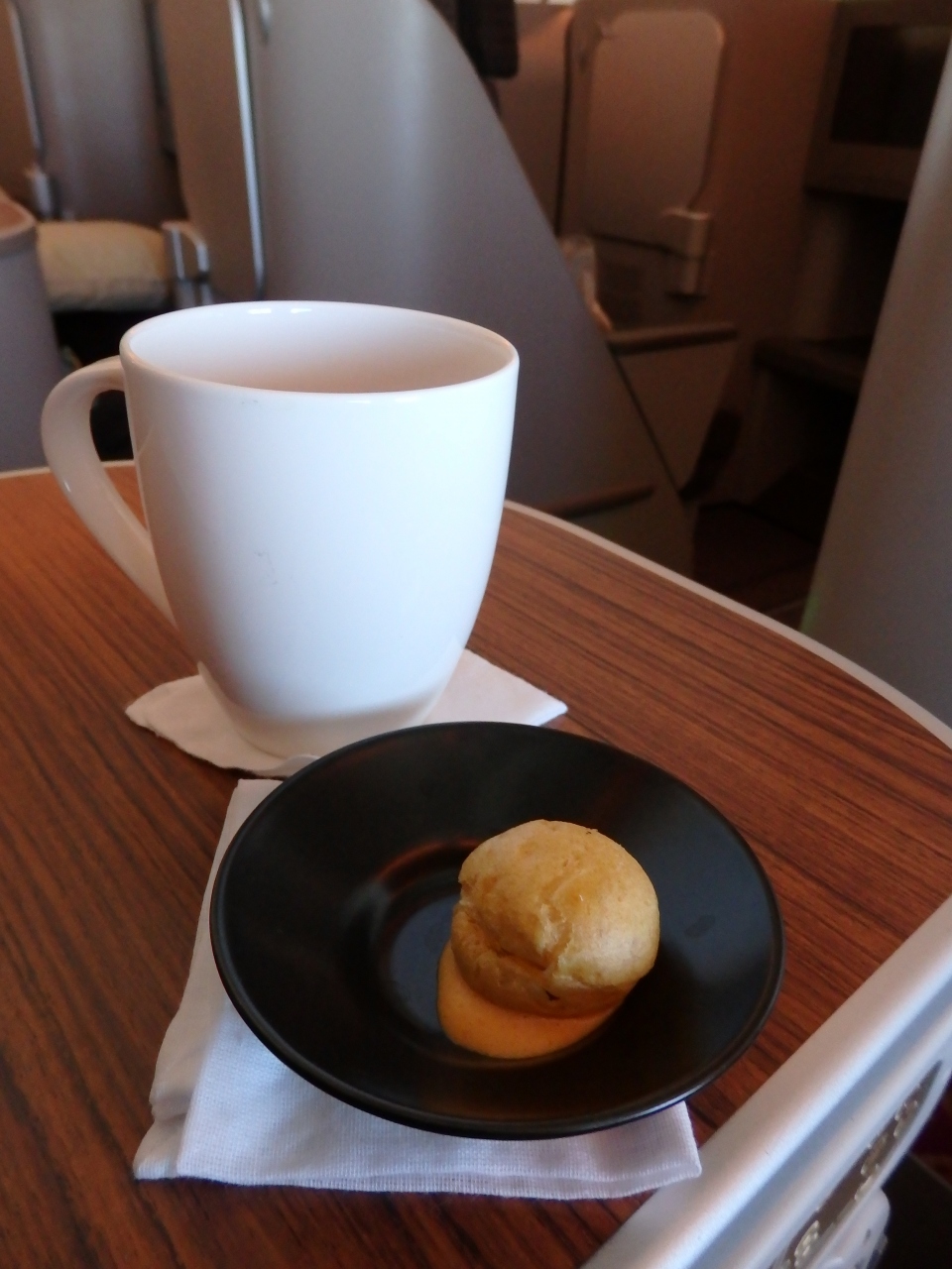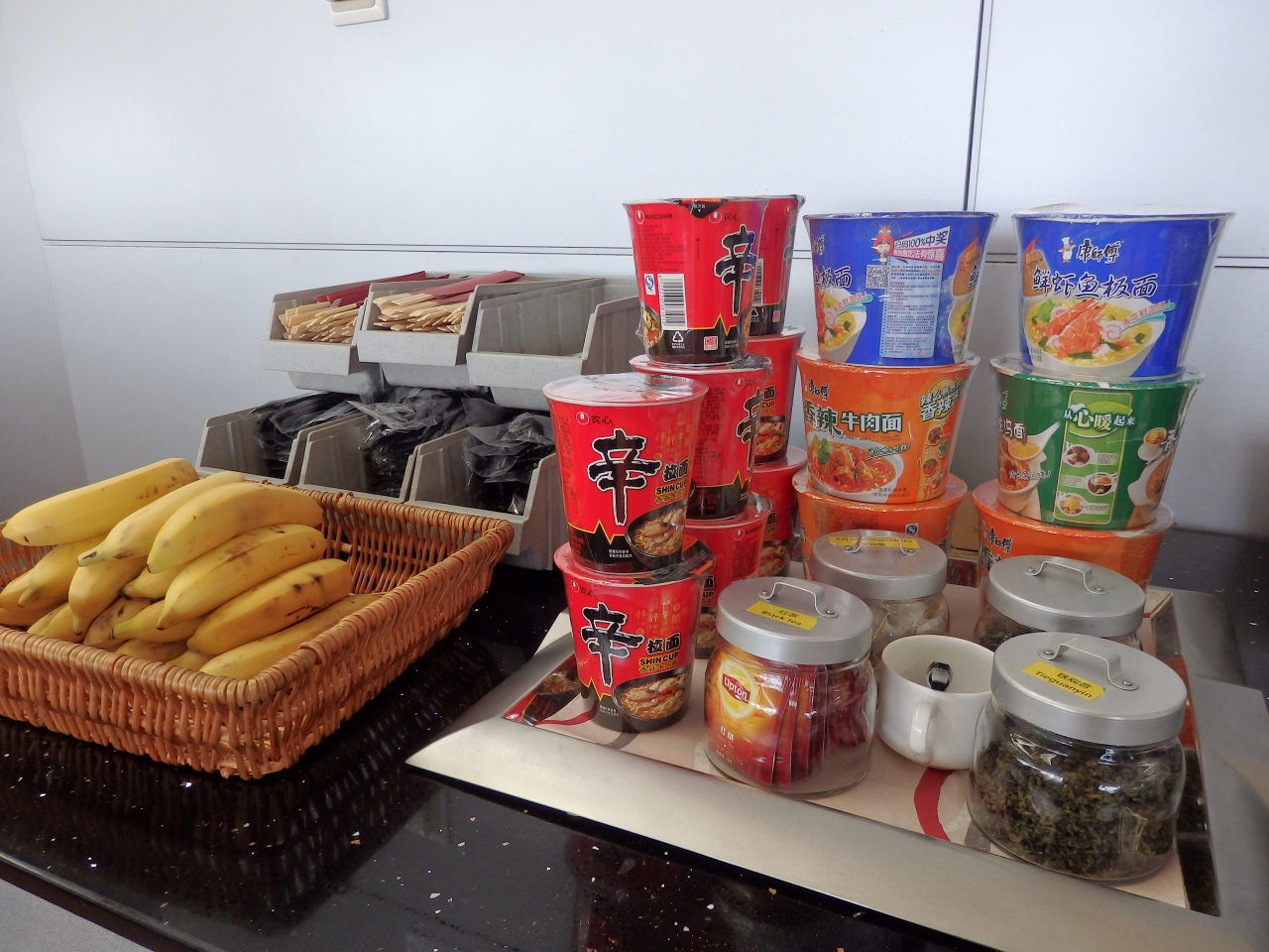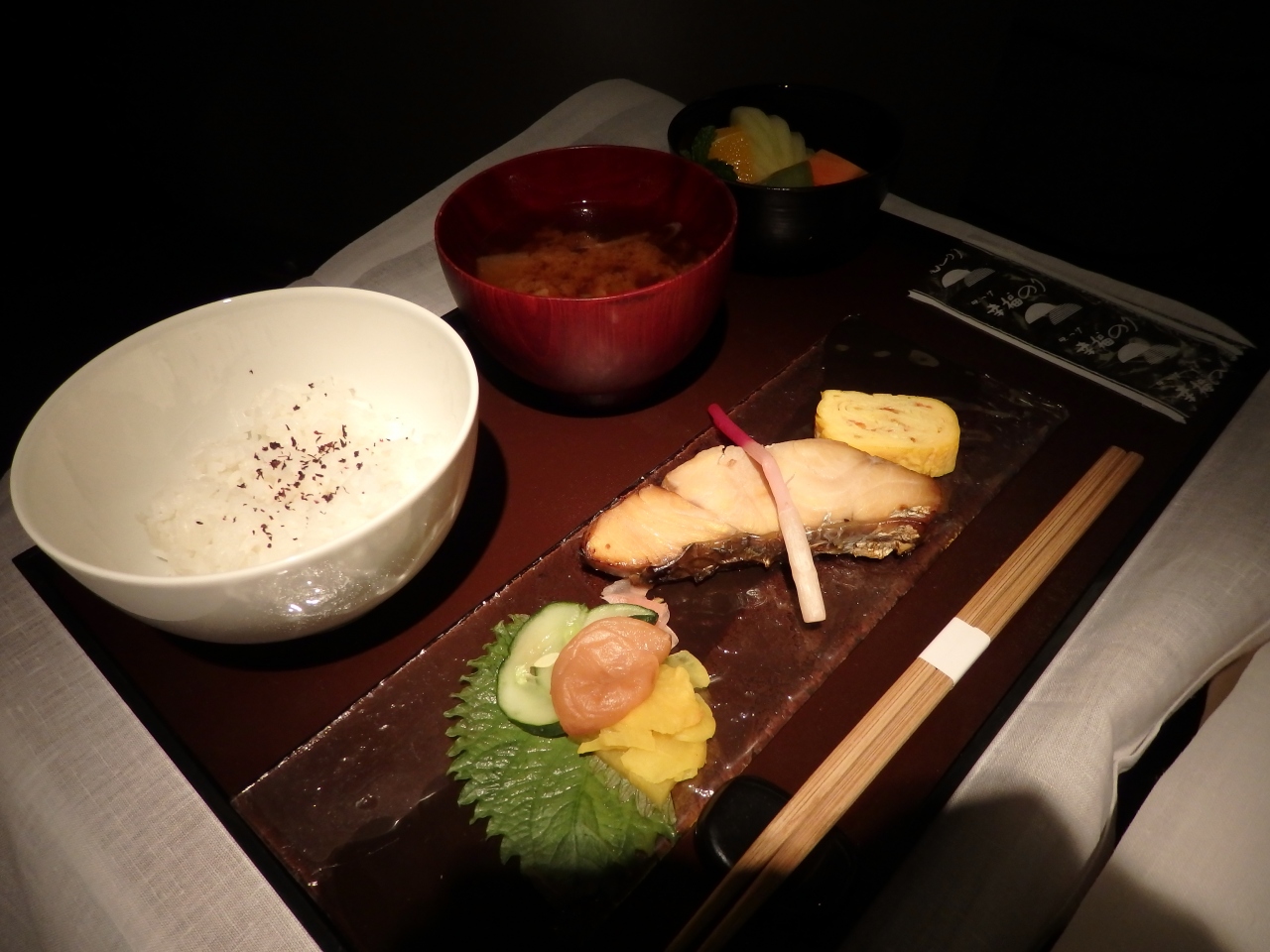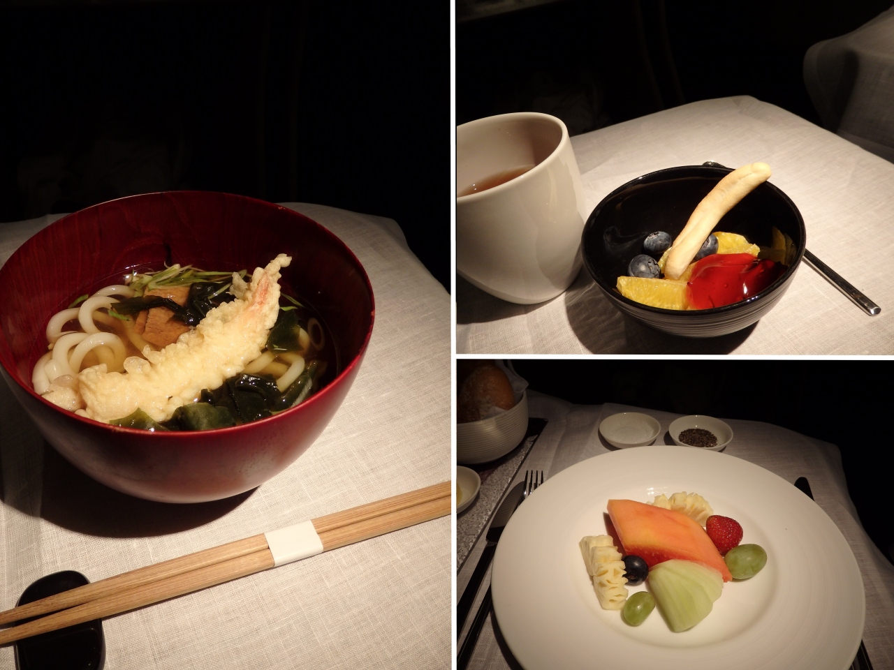 私たちはガラガラだったビジネスクラスのほうに座りましが、ファースト側にある麺カウンターで温かい麺もいただけました。- 旅行時期