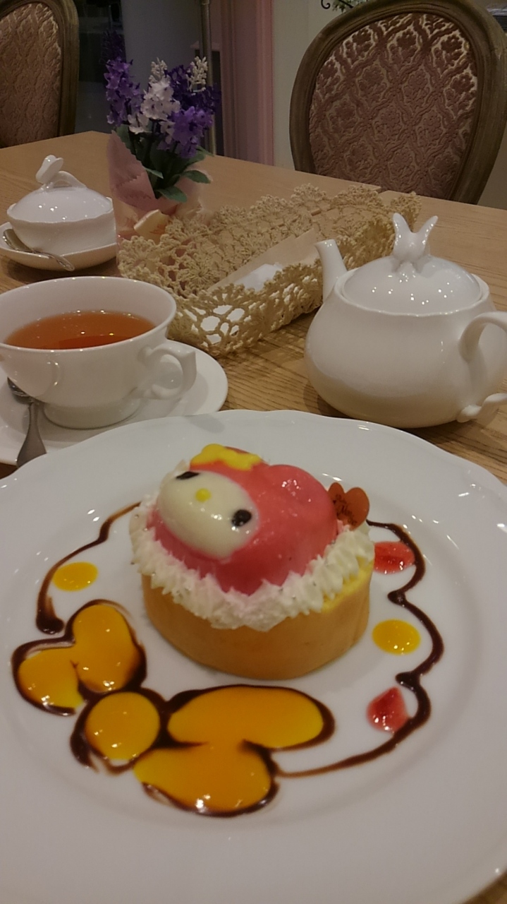 カフェ部分は4人席が3つとこじんまりしたお店で、可愛いマイメロディとキティのケーキもあります。
