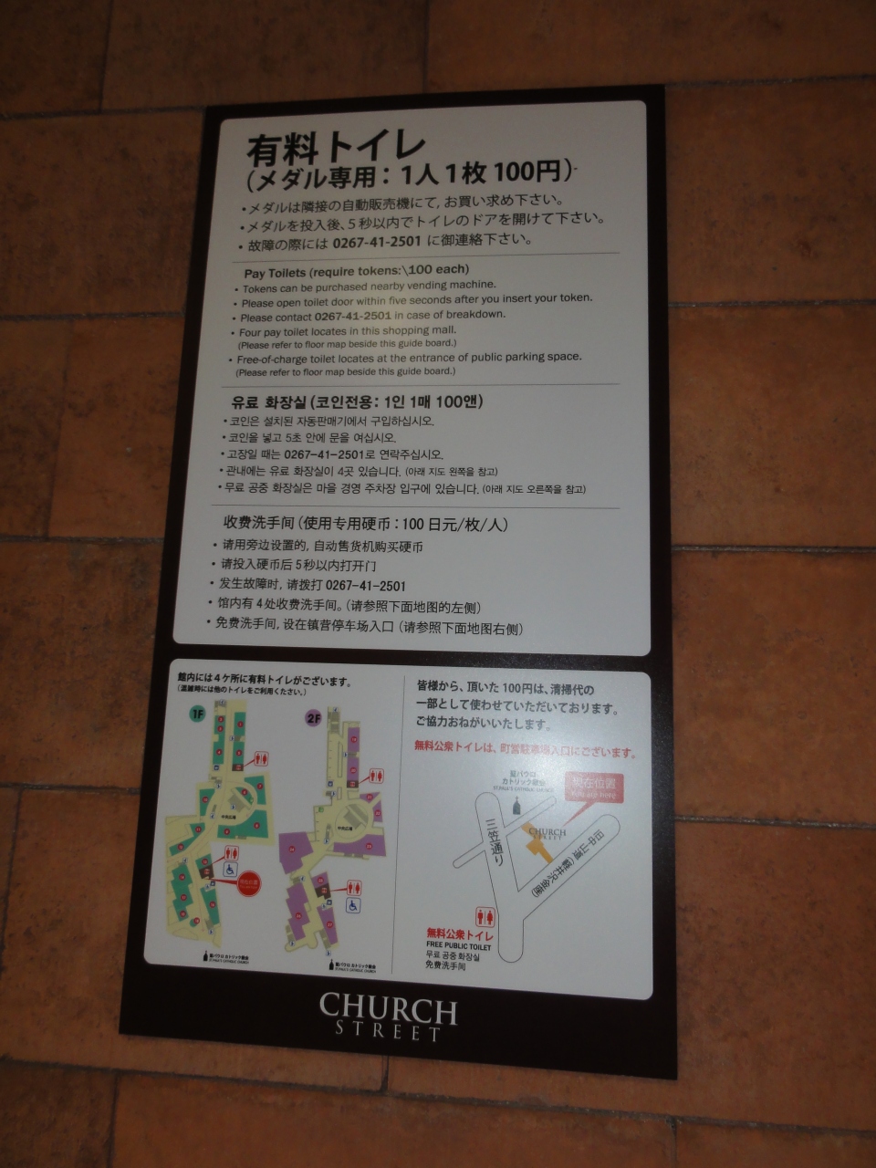 チャーチストリート軽井沢のトイレは100円でメダルを購入し、それを入口で投入してドアを開けるタイプの有料トイレ。