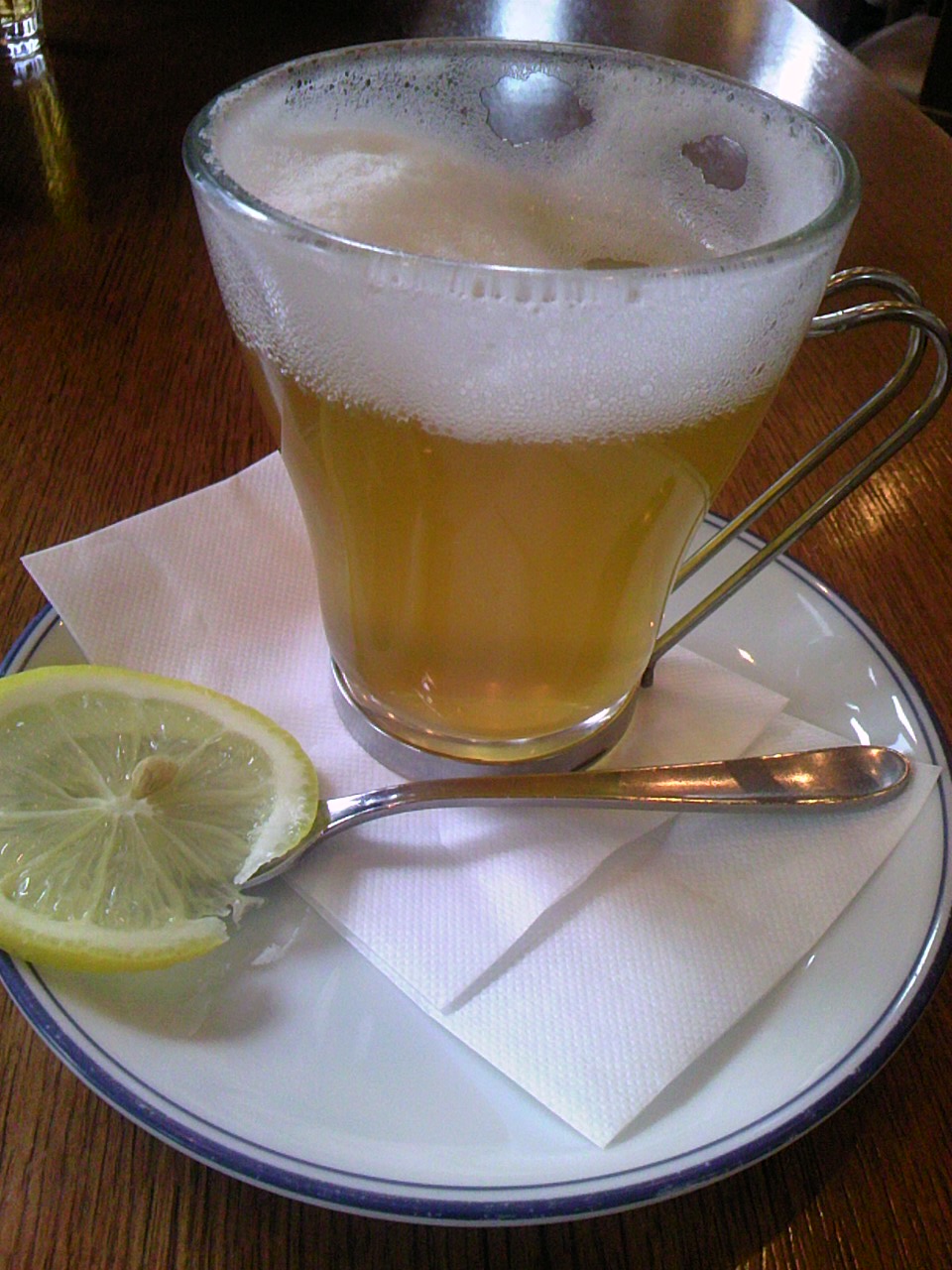 ホットスタウトとホットヴァイツェンの2種類から、苦味をおさえレモン・シロップと好みでレモンを加えて楽しむホットビール、ホットヴァイツェンを注文。