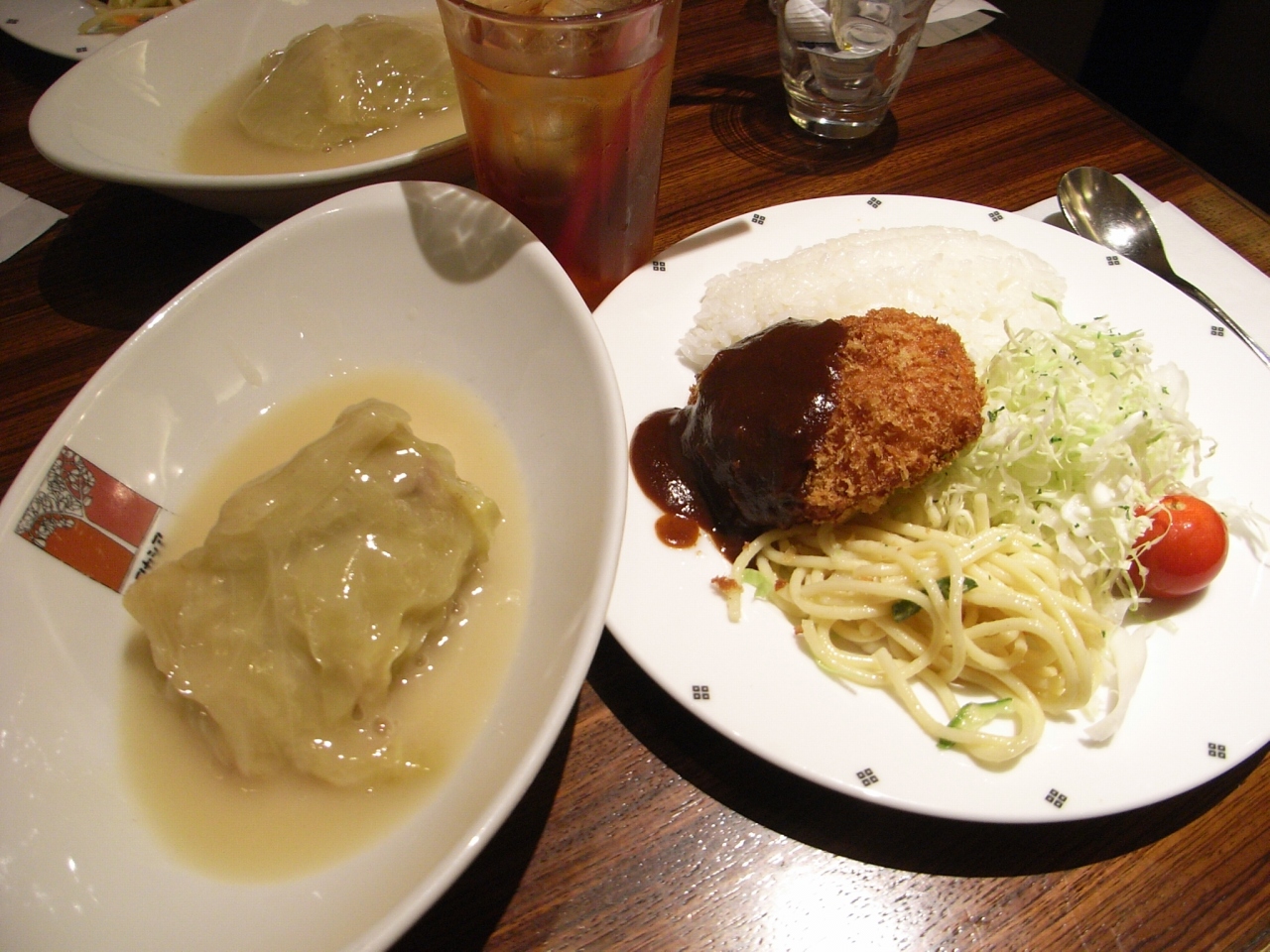 お得なアカシアランチは4種類、クリームコロッケ・ミートポテトコロッケ・ハンバーグ・日替わりのなかから選べてロールキャベツ・ドリンク付き1250円です。