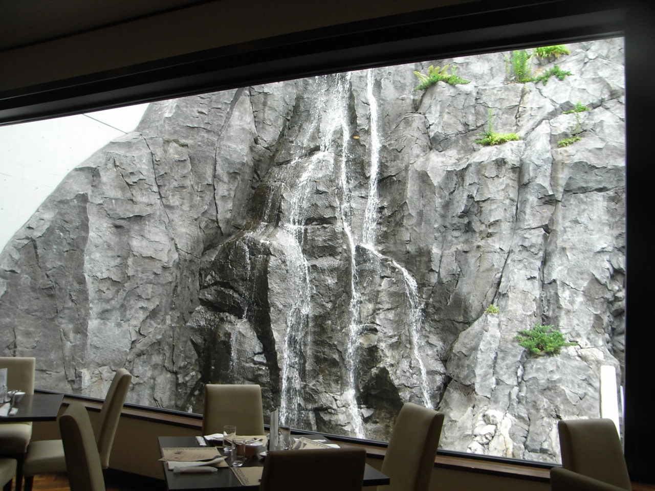 窓いっぱいに広がる、25mの人工滝の流れを見ながらお食事ができます。