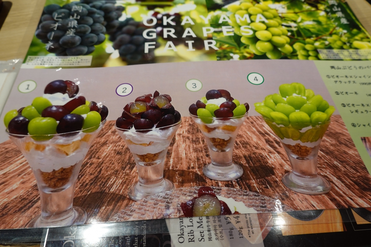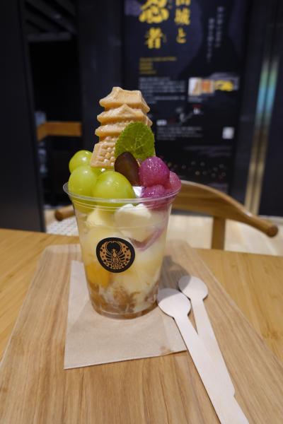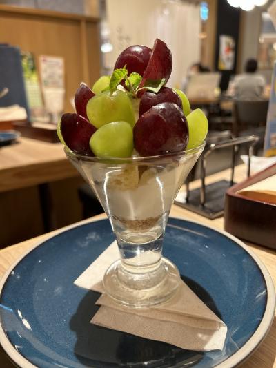 シャインマスカットとピオーネのフルーツパフェが選べ、お食事はちいさめサイズなスイーツセット(+330円で2,189円)を注文。