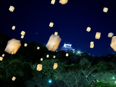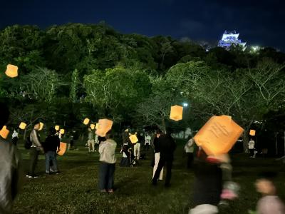 ライトアップされた館山城をバックに ホンワリやさしく輝きながら舞いあがるランタン、とてもとても美しい光景でした。