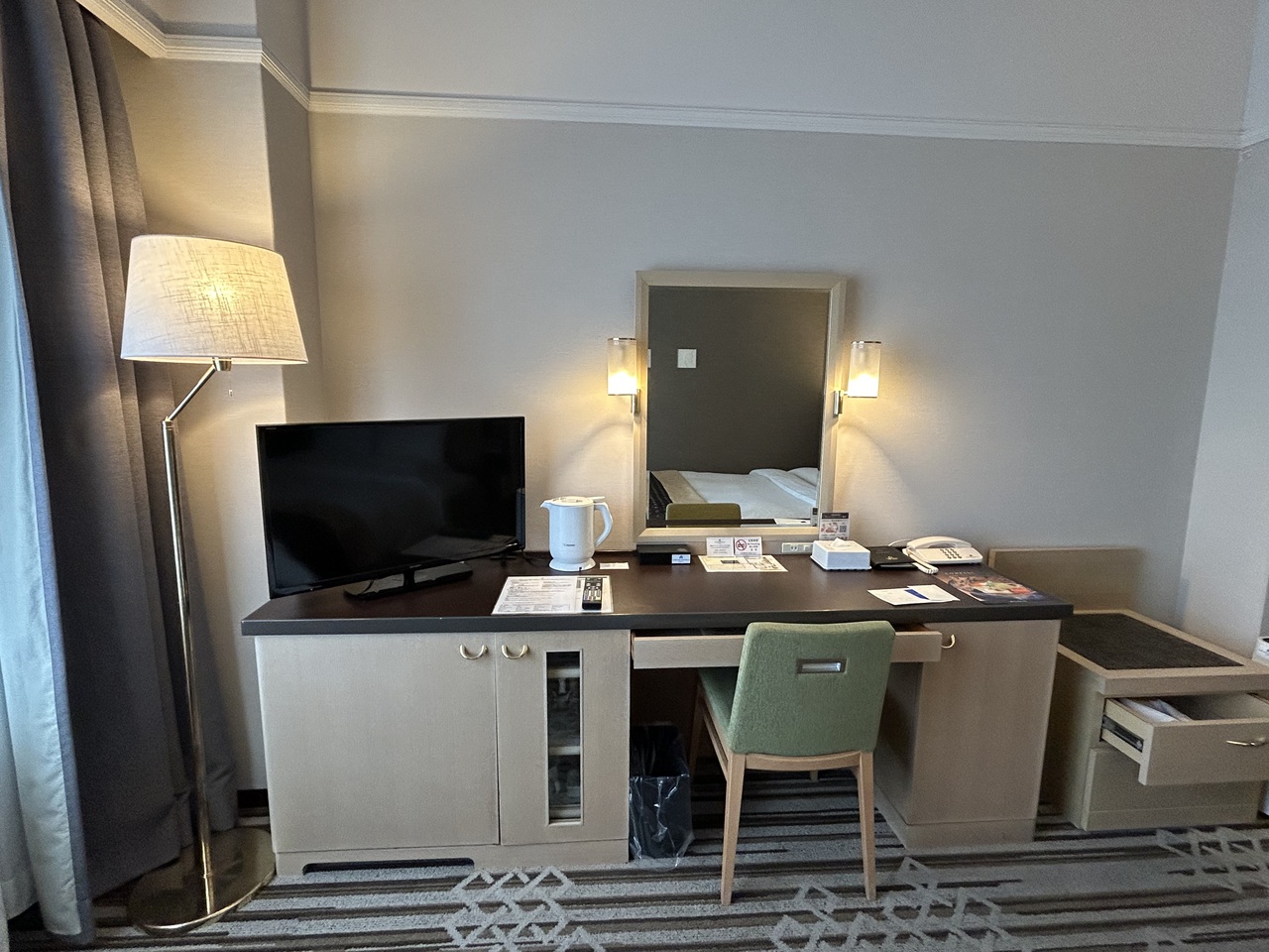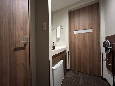 お部屋の設備は一般的なビジホとかわりありませんが、フロント前のセルフアメニティコーナーにはフレーバーティーやカフェオレ、アイマスクも置かれ 大充実。