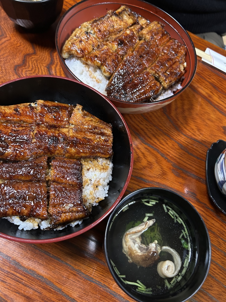 定食もありますが、あまりお腹が空いていなかったので 上丼(うなぎの量が1.5倍)とゴハン少なめでおねがいした(並)丼を注文、どちらも+100円で肝吸にしてもらいました。