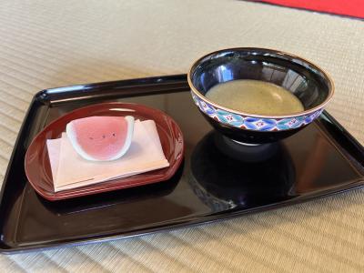 地元のお店でつくられたカワイイ羊羹の西瓜をいただいて 美味しい抹茶を一服。