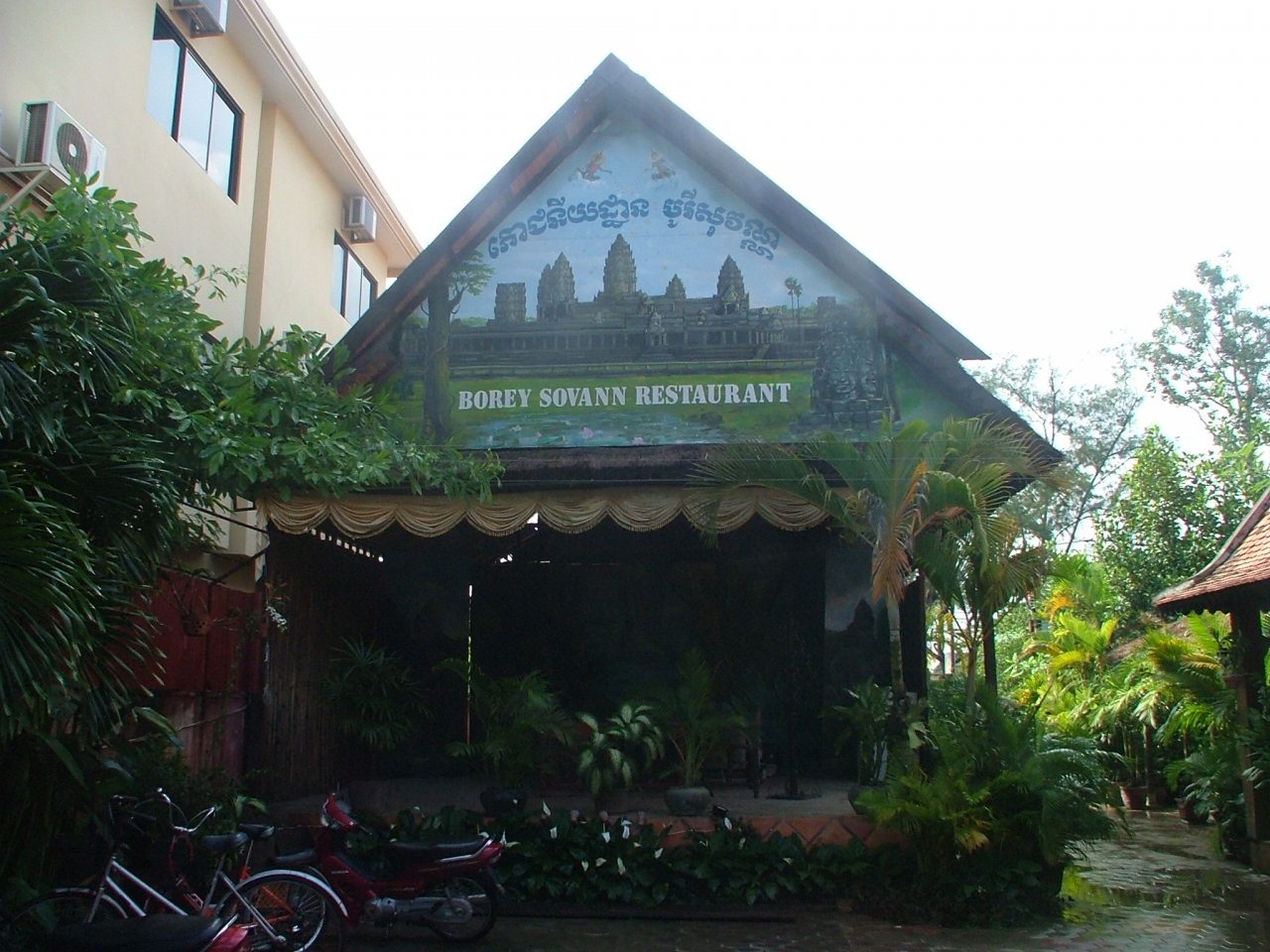 カンボジア料理の店です。料金は外国人料金で1品$3程です。英語メニューのみ。3品、ナスと豚肉のガーリック炒め、牛肉とカシューナッツとタマネギ炒め、エビ炒め、みんな美味かった。フランス人ばかりで日本人は我々だけだった。