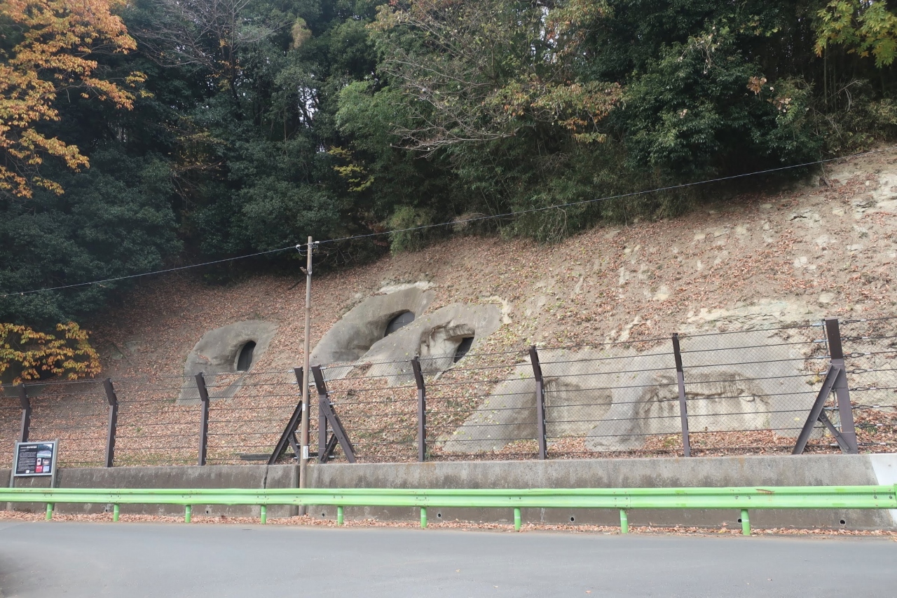 こちらの横穴墓は6世紀末から7世紀にかけて造られたもので、天井部分を浮き彫りしている「家形横穴墓」として全国的にも珍しい横穴墓だそうです。穴の前にはフェンスがつけられていたので、中の天井の浮き彫り部分は見えなかったのですが、穴が家形になっているのは分かりました。