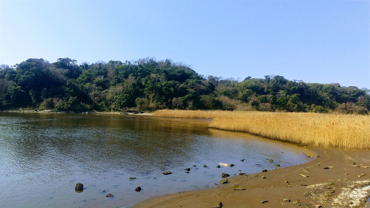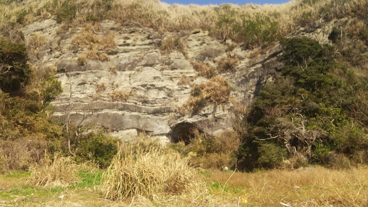 岩礁のみちの途中にあります。江奈湾のあと一旦海を離れ、再び毘沙門天浜から海に出ます。そこから岩礁地帯を歩いていくと右手の崖のところに洞窟があるのが見えます。毘沙門湾に出る手前です。何の案内も出ていないので、気をつけていないとスルーしてしまうかもしれません。しかしいずれにしろ、洞窟前は草木が鬱蒼と茂っており、近づけそうにはありませんでした。