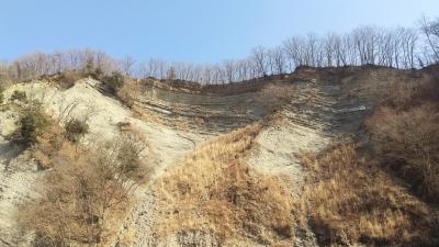 おがの化石館の2Fのバルコニーからも見ることができますが、化石館から5分くらいで行けるので、ちょっと行ってみるのもいいかと思います。遠くで見るよりも、やはり近くで見る方が迫力があります。駐車場は見当たらなかったので、車ならば化石館に停めて行かれる方がいいかもしれません。バスの場合は泉田バス停から徒歩20分くらいです。グーグルマップでようばけを検索すると、実際のようばけの崖の方に誘導されてしまうので、おがの化石館で検索するといいです。ようばけを眺めることができるのは化石館側の川岸からになるからです。