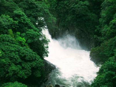 一湊海水浴場から車で2分くらいのところにあります。島の外周をまわる県道から入ってすぐのところで、駐車場も広いです。駐車場の先に滝への道があり、最初はきれいに整備された道なのですが、最後だけ急な山道みたいになっています。とは言っても距離は短いので、たいしたことはありません。滝は岩を伝って広がるように落ちてきて、とても優美で美しい滝でした。豪快な滝が多い屋久島では珍しいタイプの滝かもしれません。ただし、雨の日に訪れたせいもあるのかもしれませんが、見た目は優美でも、ものすごい轟音を響かせていて、それなりに迫力もありました。