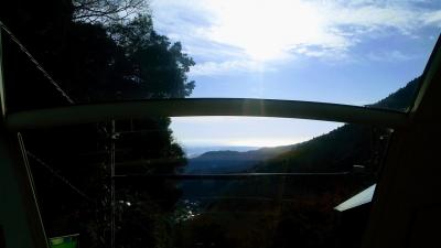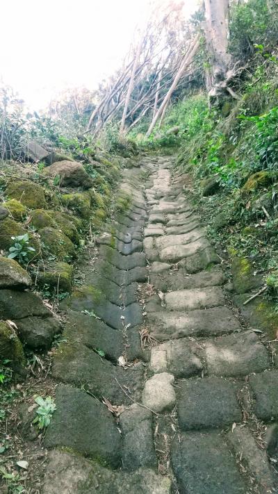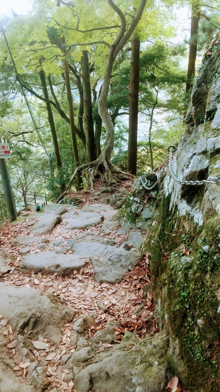 行きはケーブルカーで登りましたが、帰りは徒歩30分だというし、女坂の方ならそれほどきつくはないんじゃないかということで、ケーブルカーなしで女坂を行くことにしました。出だしから結構急な階段から始まり、階段後の坂もなかなかにワイルドな感じ。ただし、男坂とは違って、急な階段や坂のところにはきちんと手すりや鎖が設置されています。手すりや鎖につかまると降りやすいので、滑り止めがついた手袋や軍手があるといいかもしれません。素手だと、手がめちゃ冷えました。
