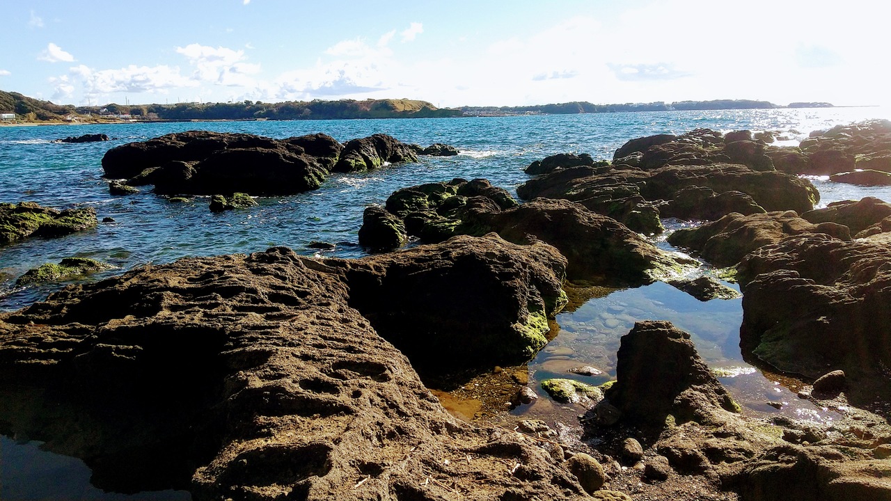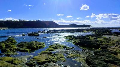 荒崎公園の潮騒のみちを通って和田長浜海岸に行こうと思ったら、途中で道が途切れていたので、引き返してソレイユの丘経由で行くことにしました。キャンプ場の先に長浜の方に降りる道があって、岩場で磯遊びができるようになっています。