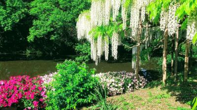 5/3に訪れました。紫の藤の花は若干見ごろを過ぎているのかな?という感じでしたが、それでも十分きれいでした。紫の藤の代わりに、白藤がちょうど見ごろで、黄色の藤が咲き始めという感じでした。藤以外の花もたくさん咲いていて、園内のどこに行っても楽しめました。