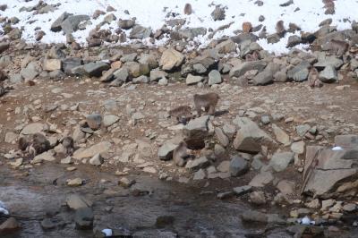 地獄谷野猿公苑の入り口から道沿いの下方にずっと並行して流れている川になります。野猿公苑の温泉近くでは川原の方まで下りて行くことができます。温泉の中でまったりしているお猿さんとは違って、川の近くにいるお猿さんたちの動きは活発で、すぐ近くで両方を楽しめるのが魅力です。