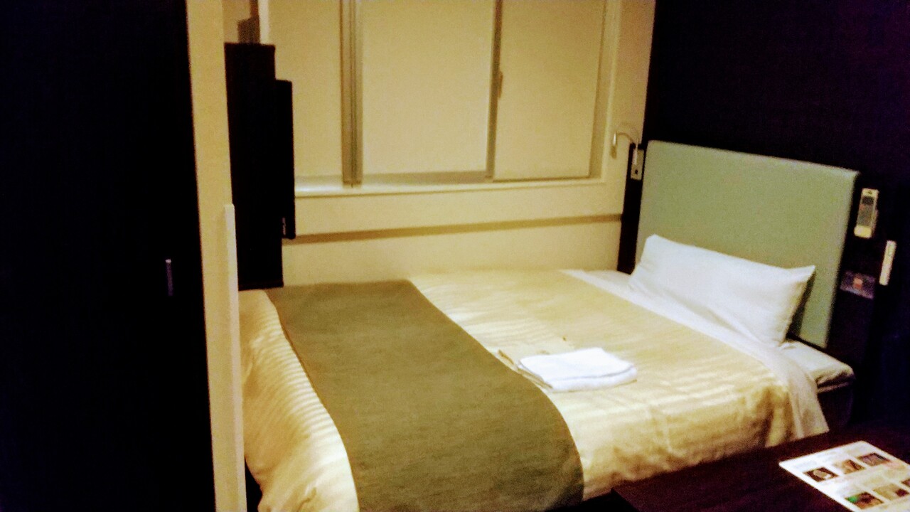 お部屋はやや狭いのですが、ベッドとテレビが大きいのが印象的でした。ゆっくりと映画を見て過ごされる方にはいいかもしれません。部屋のユニットバスも少々狭いのですが、ゆったりと入れる天然温泉がついているので問題はありません。