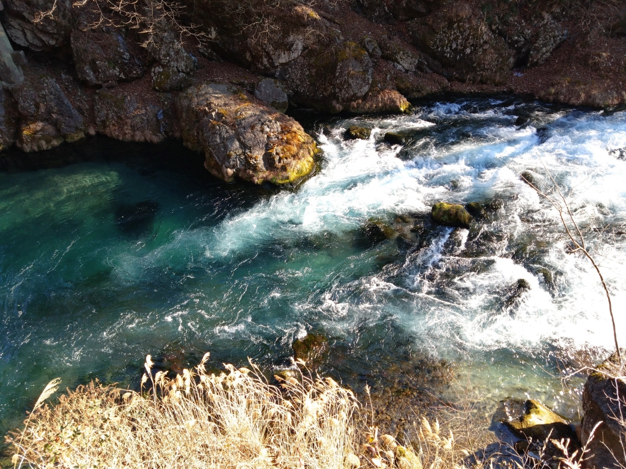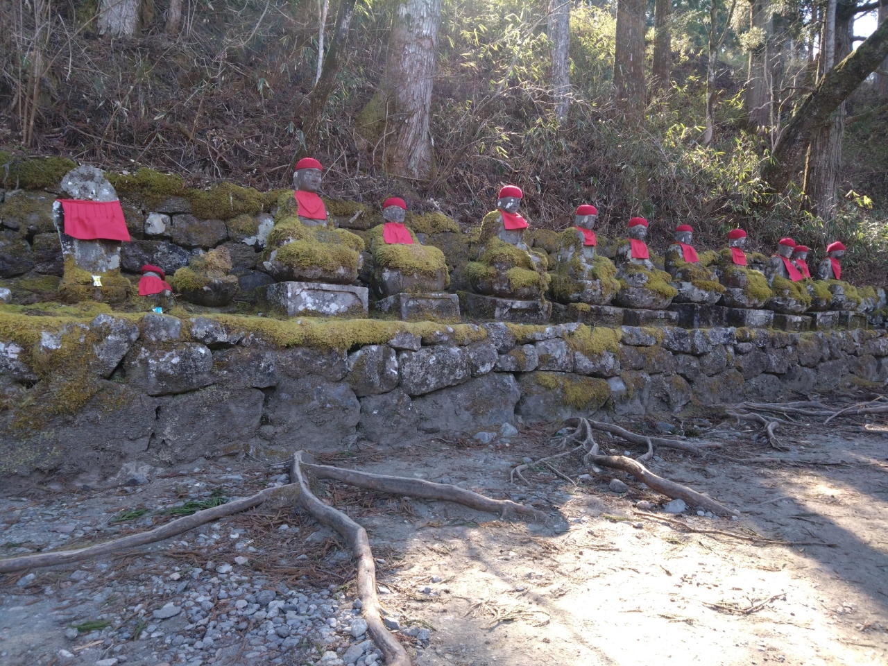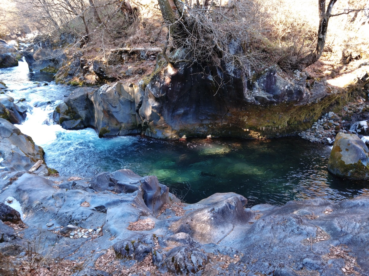 1月下旬に安良沢バス停で下車して、大日橋を渡り、歩道を少し歩いていると、化け地蔵が現れました。憾満ヶ淵はその化け地蔵がある辺りの散策路の下方に流れる川を指すようです。男体山から噴出した溶岩による奇岩と大谷川の渓流が美しい景観を作り出しています。化け地蔵がある慈雲寺の趣がある境内と憾満ヶ淵の渓流と一度に二つ楽しめるのが魅力です。