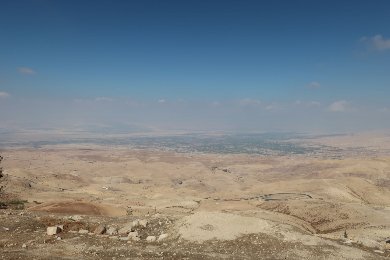 聖地エルサレムを中心にして、北はフェニキア人都市のタイアとシドン。南にエジプトとナイル川。西に地中海。東にアラビア砂漠が描かれています。また、死海やヨルダン川、ヨルダンのカラクやマダバなどの都市も見てとれます。