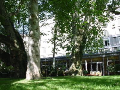 カエデ葉プラタナスとカスターニエンの巨木が空を被い、時折カスターニエンの花が舞い落ちます。