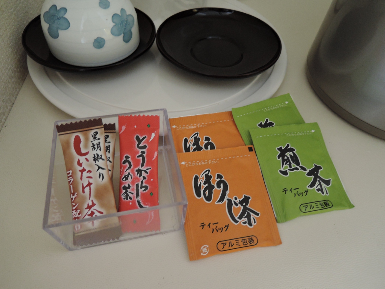 お部屋にはお茶が、緑茶、番茶、梅昆布茶、シイタケ茶と4種類も