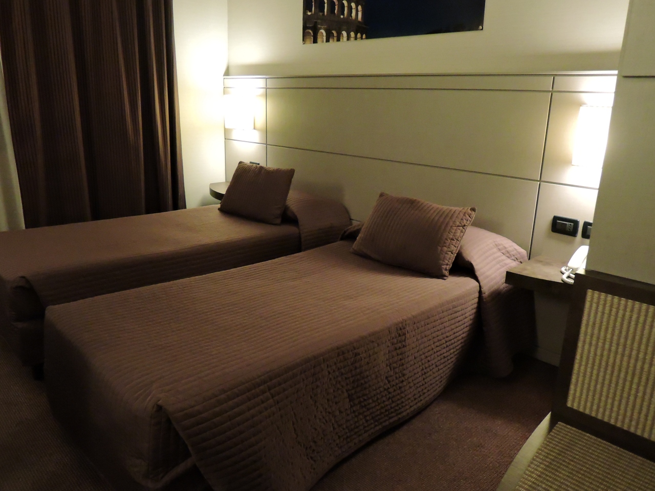 ホテルの周りには何もない住宅街ですが、ツアーバスで、夜遅くローマに着いて、翌早朝出発したので特段の不便はありませんでした。お部屋はバス・洗面所は綺麗でした。