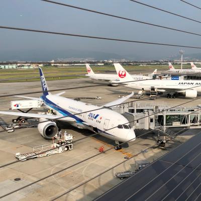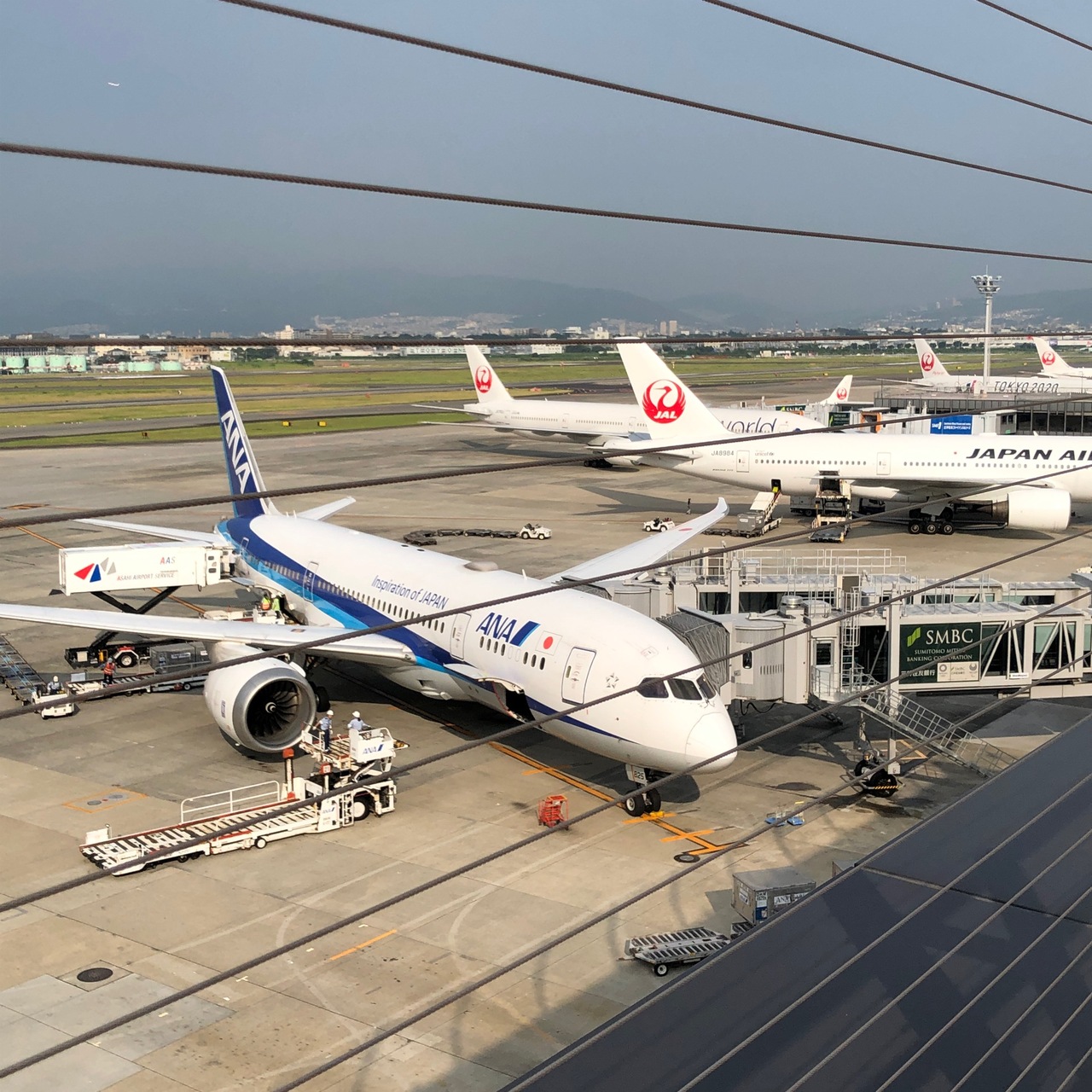 朝8:00に伊丹空港に到着、フライトまでたっぷり時間があったので展望デッキに出てみました。曇天でしたが、気温も湿度も高く、汗が吹き出してきたので速攻で冷房の効いた屋内へ逃げ込みました。