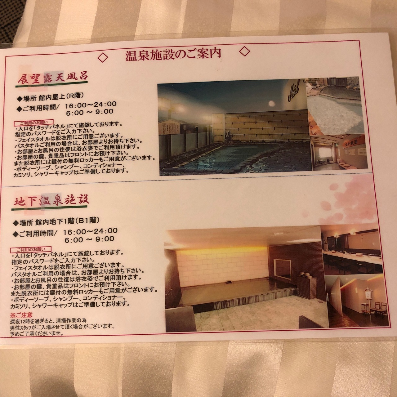 部屋の風呂は入る気がしなかったので、夜はB1Fに温泉大浴場に、翌朝は屋上の露天風呂に入りました。たいへん良いお湯でした。