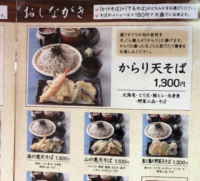 定番メニューとおぼしき「からり天そば」1300円を注文しました。そばに鶏天の組み合わせは初めてなんじゃないかな?、これもありと思います。- 旅行時期