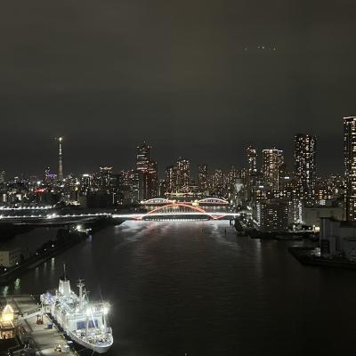 この日の部屋はリバービュー、要するにレインボーブリッジが見えない方。隅田川にかかる橋のライトアップとスカイツリーがキレイ。