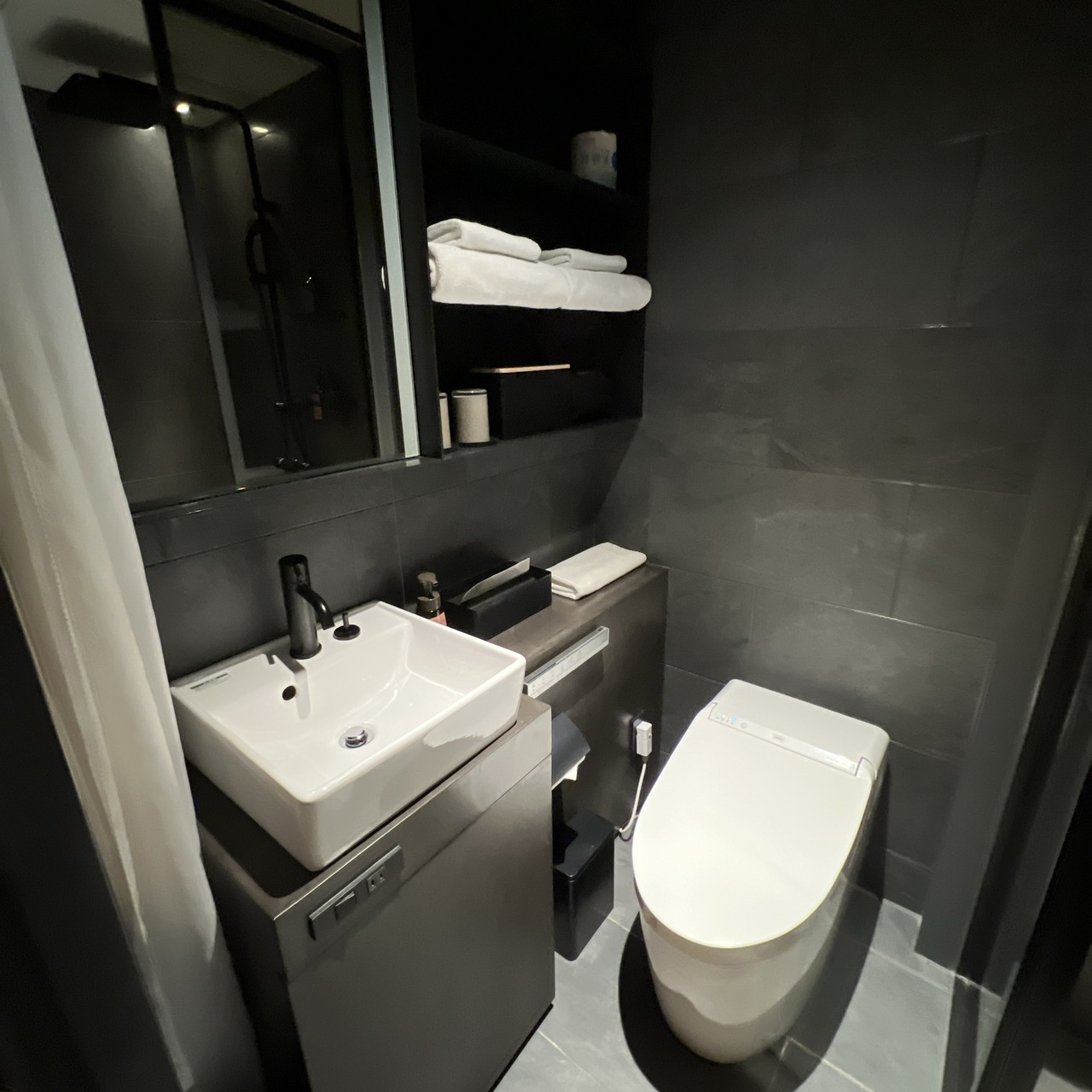 客室階は白いカーテン風の布がいっぱいで驚きました。客室は洗面台をはじめどれもとてもシンプルです。良く言えば機能的、悪く言えば…(以下、省略)。