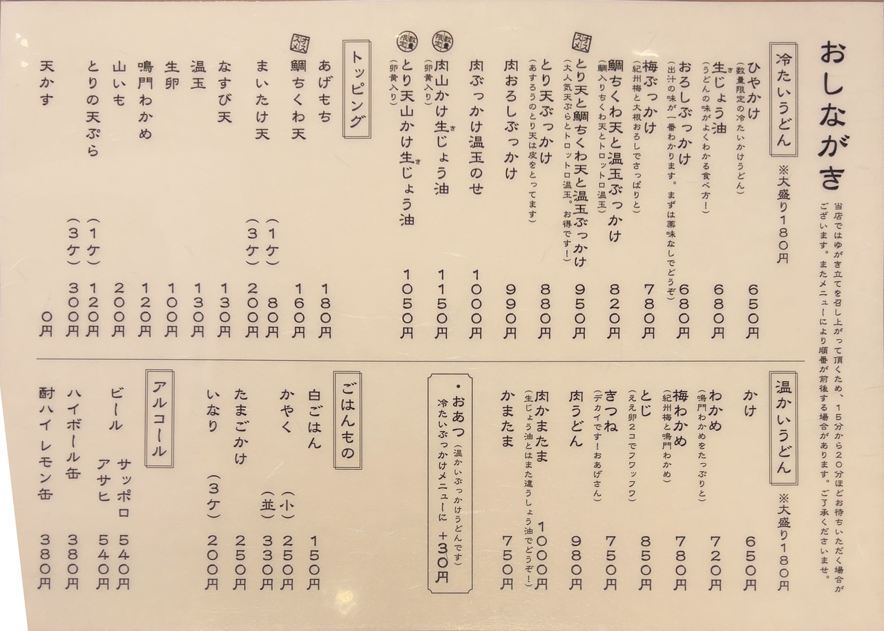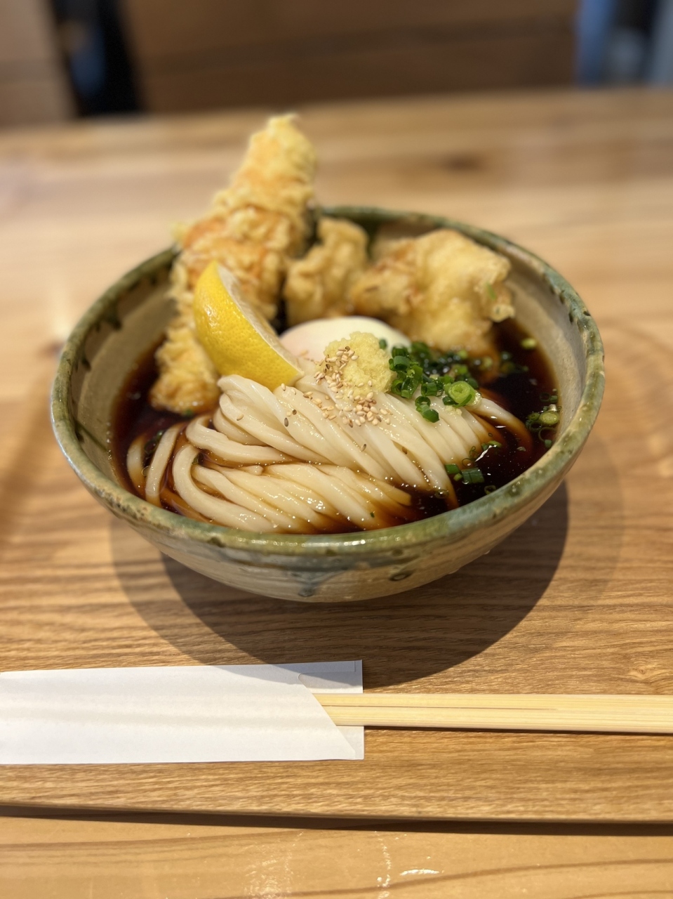 おすすめの「とり天と鯛ちくわ天と温玉ぶっかけ」を注文、麺がキラキラ、喉ゴシがチュルンと素晴らしい美味しさです。こんなに美味しいうどんを食べたのは久しぶりです。ご馳走様でした。必ずまた来ます。- 旅行時期
