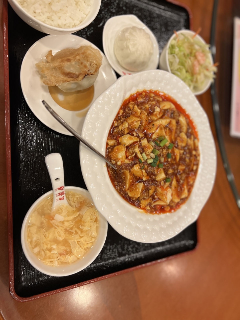 マストオーダーと言われている麻婆豆腐のランチセットにしました。サラダとスープに点心が二皿、ライスがついています。