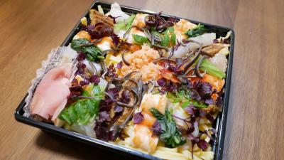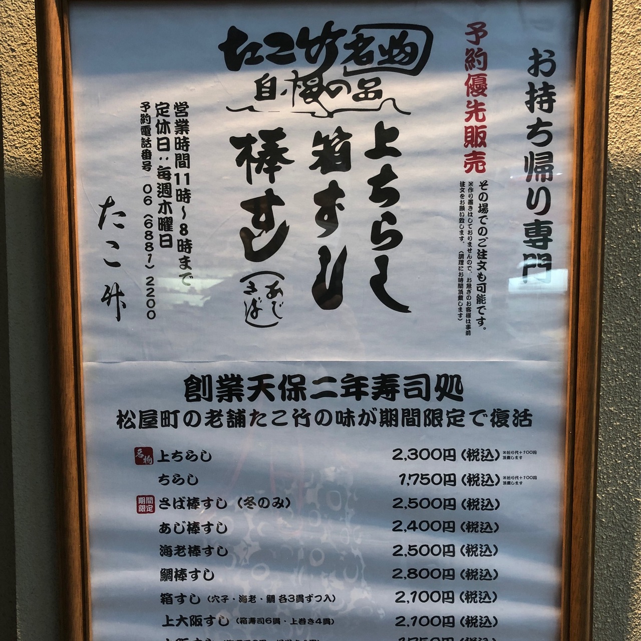 天神橋筋商店街に最近?移転オープンした、お持ち帰り専門のお寿司屋「たこ竹」さんで、ちらし寿司をテイクアウトしました。
