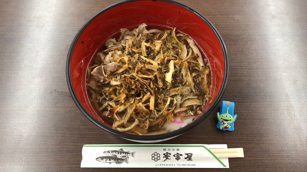 山口なので瓦そばかとも思ったが、ごぼううどんが気になって注文した。表面はごぼうの天ぷらで覆われています。その下の麺はごぼうが練り込んであって茶色くなっています。