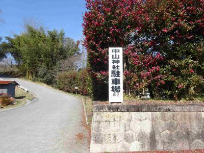 大鳥居の左に数台駐められる駐車場がありますが、そのさらに左に「中山神社駐車場」というガイドがあります。坂を登れば大駐車場があります。