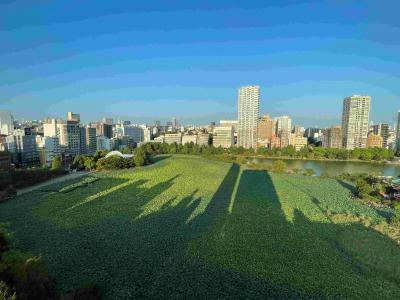 最上階15階でした。窓の向こうは一面不忍池、そのかなたに東京の街並みが広がります。これほど眺望のいいホテルは初めてです。