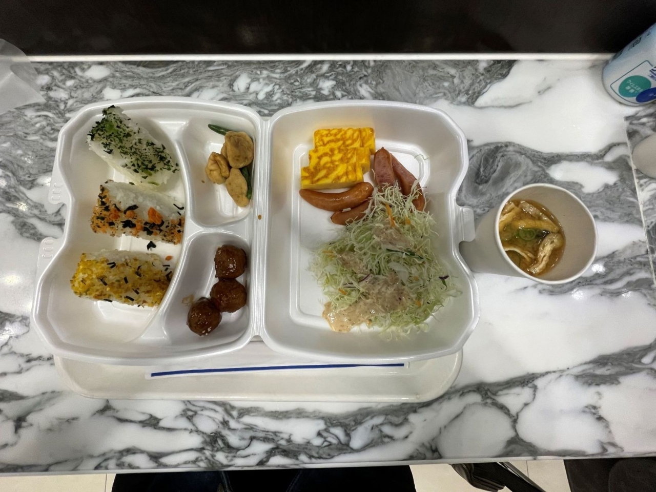 朝食は徹底したコロナ対策。写真のような発泡スチロール製の容器と紙コップに好きなものを自分で選びます。会場で食べてもいいし、部屋に持ち帰ってもOK.。食後はトレイ以外は全部まとめて捨てられます。