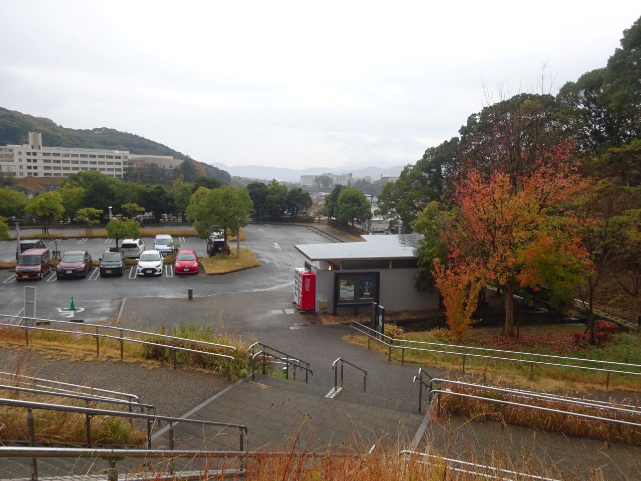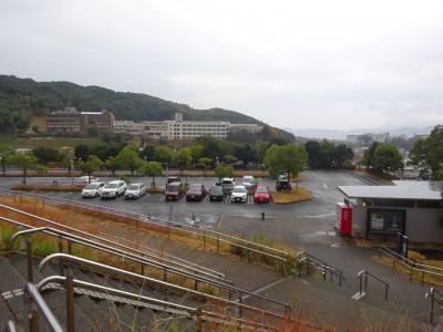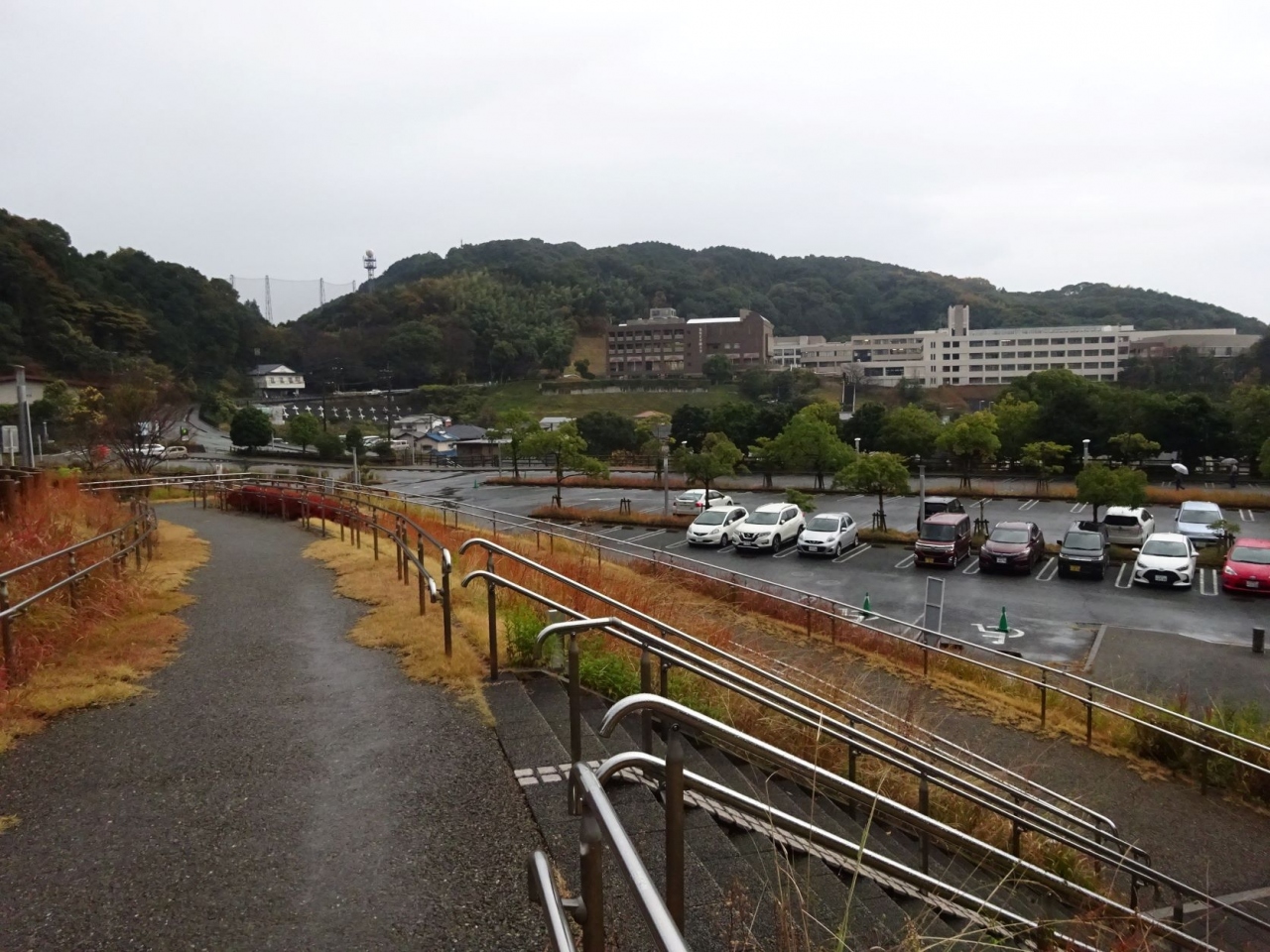 駐車場は一段下の丘の中腹です。十分な広さがあります。身障者用の駐車場と同じ入り口で、身障者はそのまま直進、健常者は左折します。駐車場からの階段が長いので、年寄りも上まで上がれたら嬉しい。上がれなくはないけれどちょっときつい。