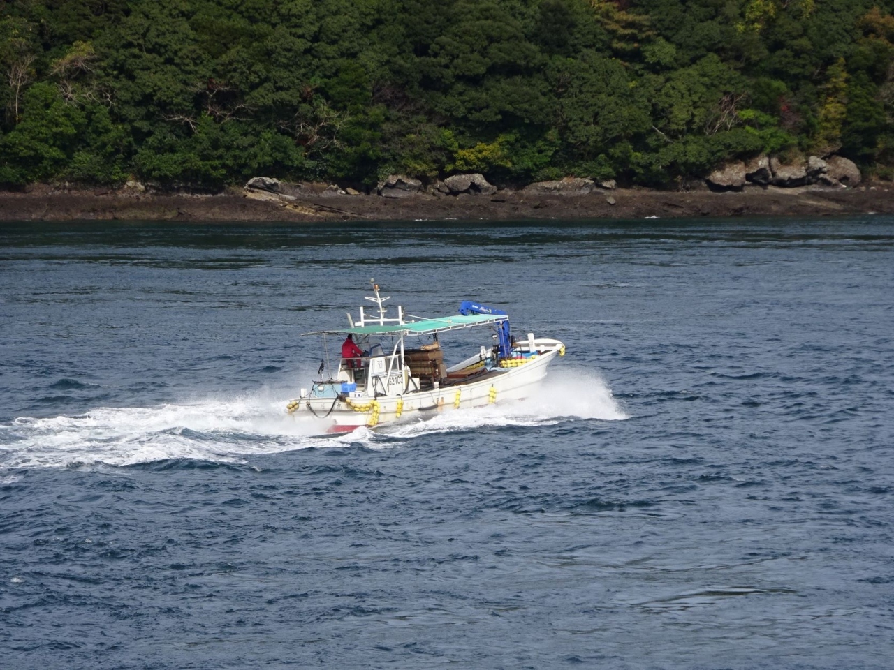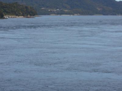 海面が近く、渦潮らしい波立ちが見えました。運良く漁船が海峡を通りましたので、渦潮を横切ったらしく、激しく白波が立っておりました。