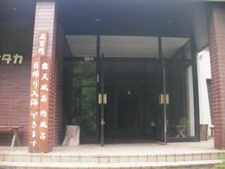 笠新道の入口から林道を下っていくと一般者通行止めのゲートの先に新穂高温泉ニューホタカがあり、温泉に入っていきます。玄関でレインコートを脱いで、玄関を入った受付で料金500円を払って、廊下の先に狭い脱衣場には籠が並んでいて貴重品ボックスはありません。